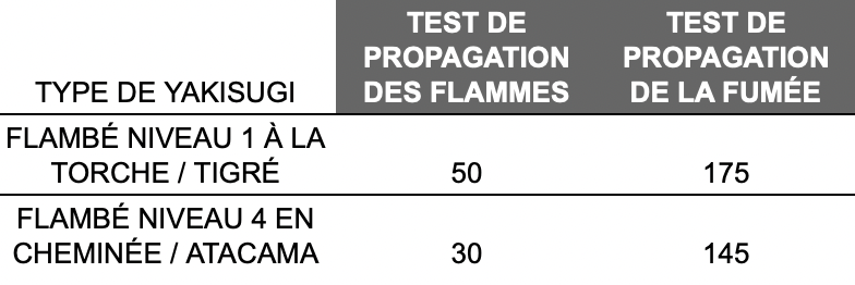 En effet, lorsque vient le temps d’analyser des matériaux de construction, deux critères principaux sont pris en compte en égard aux risques d’incendie: les vitesses de propagation des flammes et de la fumée. Dans les deux cas, le yakisugi offre un très bon rendement.